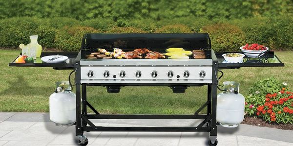 It’s party sized! This 8-burner gas grill delivers 116,000 BTUs of heat over a 1,006 sq. in. surface, plus the legs fold to fit in a standard pickup bed.