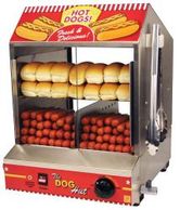 This unit not only accommodates any size hot dogs and sausages, but it allows them to be cooked simultaneously. This hot dog steamer has a submersible heavy duty stainless steel heating element that will shut off when the water in the 8 quart water reservoir drops below a certain level. For added versatility, an adjustable thermostat allows this unit to operate in a wide variety of cooking and holding conditions. The Dog Hut hot dog steamer has a maximum capacity of 175 hot dogs and 40 buns.